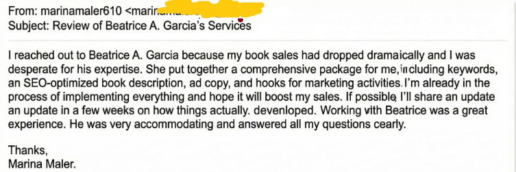 At Authors Hub, our clients are at the heart of everything we do. Your trust means everything to us, and we are deeply committed to ensuring that every experience you have with our team reflects the highest standards of professionalism and integrity.If at any point during your journey with us you encounter any conduct from any of our collaborators that makes you uncomfortable, falls below our standards, or raises any concern we ask that you contact us immediately. No issue is too small. Your voice matters and every concern will be handled with the utmost confidentiality and urgency.Please reach out directly to our founder at contactbeatriceagarcia@gmail.com we will respond promptly because your trust is not something we take lightly.Beatrice A. Garcia, Founder, Authors Hub
